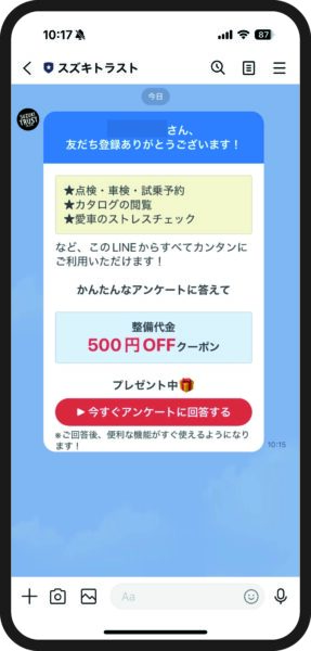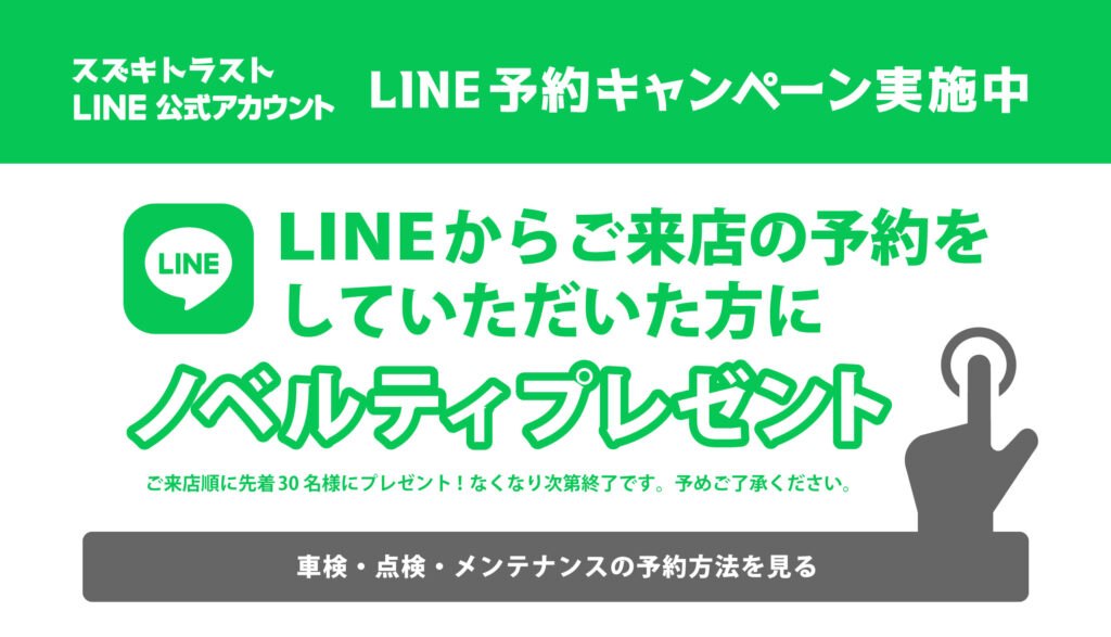 スズキトラストグループだけのお得なキャンペーン情報や新車情報、カーライフに役立つ便利な情報を配信中!点検時期のお知らせもLINEで届きます!