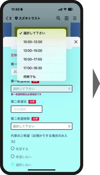 ⑦同様に「第二希望日」と「第二希望時間」も選択してください